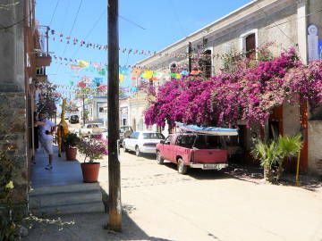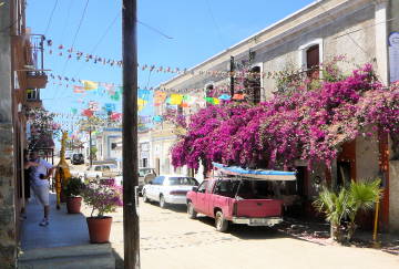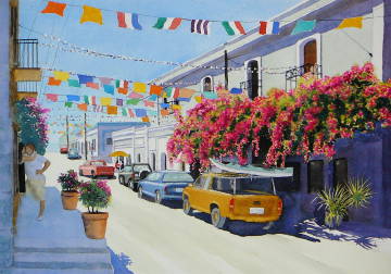 I attack the bougainvillea with water spritz and add Permanent Magenta to cool the flowers and add some dimension to the sprays. After letting this dry, I do the same with the foliage, charging in a very dark green from Prussian blue and Sepia into shadowed areas. This is a substantial improvement. Having the courage to go really dark in parts can often be the making of a painting. I add some windows into the shadowed wall at the right. Now for the shadow over the whole left side. There are difficulties here; it could easily ruin the painting. I don't want it too dark because I want it to recognize the reflected light from across the street and I want it to be luminous but, conversely, I don't want it to be too wimpy or it will not set off the light down the street. Also, the black of the woman's dress that I have already painted is going to bleed if I use too much brush action. Maybe I should have painted that after the shadow but it might look like an afterthought then. Enough, after due thought there comes a time when you just have to go in and do it – one bold wash over everything without fiddling. The shadow of the potted plant on the road echoes the filigree shadows at the right. The value turns out a little on the wimpy side but its OK. I make the flowers on the pot plants Opera because I want more of that on the left. Being happy with the color of the truck, I paint it and the kayak on top. I'm not too happy with the drawing of the kayak but its too late to change it now. It is as it was, which is no excuse, it would have looked better oriented more for and aft on the truck. I remove all of the remaining masking and paint the flags – a bit stronger in the foreground than down the street to use atmospheric perspective for depth. I opt for quite a lot of yellow/orange to tie in the color of the truck to the balconies on the left. I tint the potted Yucca on the right with very pale green, darker near the center and leave some white on the leaves for sparkle – its a nice contrast to the purple shadow, as I intended. Its always nice when something works out.Completing the balcony ironwork, taillights, license plates and hubcaps on the vehicles, I also add telephone poles and wires. Scratching highlights on the sides of the vehicles, I put in a few small figures under the yellow umbrella up the street and in the distance. A Mexican street, even during siesta, isn't entirely devoid of people. Its easy to critique your own work because you know what the vision in your mind's eye was like (and you almost always fall short of that) and you know where things didn't turn out as well as planned so I'm not going to second guess what I've already said. At the end, I found the foreground of the painting unsatisfactory from a compositional viewpoint – there was just too much empty road. I tried various croppings – no artist likes to sacrifice finished work – and eventually cropped a little off each side and quite a lot off the bottom. You can see the difference between the last two illustrations and I think it improves the work. Here's the source photograph again, cropped like the finished painting. It's easy to see the deficiencies in the photograph – out of vertical verticals at the edges, sloping steps/sidewalk, confused areas, etc.© 2025 by David Cuin, all rights reserved.