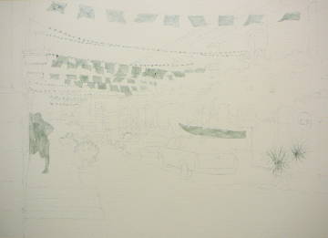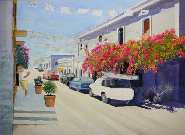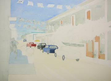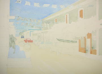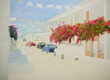 First I need to correct the perspective of the street and buildings in the sketch. The edges of a camera's lens always distort the verticals, especially if the camera is not level when the picture is taken. Of course, the telephone pole has to go and also the confusing giraffe and other items behind the couple. I add an extra row of flags closer to the observer to help establish distance. I plan to emphasize the light in the street by sandwiching it between shadow areas at the left and right. Good darks are going to be particularly important to emphasize the lights. Most of the whites in the building facades will be easy to paint around but complicated areas, like the flags, and places where I want to preserve white paper for highlights or to ensure the brightness of later color need to be masked before painting. I apply masking to the plant on the right with a pen rather than a brush to get thin delicate lines and gesture. (Click on the images to see them a little larger).Painting a watercolor is 50% thought and 50% action. Most people don't realize that. Often I'm asked "Well, how long did it take you to paint that?" The answer isn't easy because I probably began the painting while driving around town – How am I going to approach it? What techniques? What are the things to be careful of? What compositional problems are there? I make a start working conventionally from light to dark. I put in a sky with a mixture of Cobalt and Cerulean blues, cooler in the distance. I don't have to worry about the flags as they are masked. I leave out the complex happenings at the end of the street and settle for a simple hill.I apply a very pale yellowish wash to the road and here I lose a couple of opportunities. I should have left the far end of the street white, again to emphasize the light there, and incorporated more dry brush with the white of the paper shining through to simulate the glare of reflected light off the road ... but I didn't. Oh, well! Next I begin to work the initial grey-green washes on the buildings and also use some greyed Burnt Sienna for woodwork in sun. I apply a Cobalt blue wash to the top surface of the sidewalk that seems to reflect the sky. This is an underpainting for the final wash that comes later. I begin to develop the line of cars on the street. I work the vehicles using colors that I choose, rather than the actual ones, in order again to emphasize the whites, working the values on the cars to express their shape and lighting. At the end I will scratch a bit of sparkle on them to show highlights. Most of the cars were white as you see from the reference photo and that would do nothing for the painting. At this stage I leave out the nearest vehicle because I'm unsure what color to make it; I don't really want to repeat one of the other colors. Blue would be lost in the shadows in that area and red would be lost in the bright flowers, yellow would compete for attention. Why not green? Well, I could invent a reason but I just don't think the kind of green used on cars will work. Now I tackle the bougainvillea using Holbein Opera and my usual W&N Permanent Alizarin crimson. I want it really bright. I spritz the paper with water dots before beginning and during the work, protecting other painted areas with my hand, to enhance edge effects by producing some hard and some soft edges. I try to produce sprays of blooms leaving white in between. After drying the work, I apply a mid-value, yellow-green wash between the flowers with New Gamboge and Cobalt blue, charging in a dark green mix of New Gamboge and French Ultramarine while it is wet. Light spritzing was used. All this is a bit tedious but necessary.At this stage, I rather feel I've overdone the redness of the flowers and am not too happy with the result. You should always complete a watercolor, however, because it is often in the later stages that things come together. I'm hoping my darks will counterbalance this overbearing passage. I add a little bougainvillea at the left with cooler colors (it's in the shade) to carry some of the Opera color over; there will be more in the pots on the sidewalk. I start to add some mid-dark shadows with a grayed purple from Alizarin crimson, French Ultramarine and some green to develop dimensionality in the buildings. I also begin to add the doorways that punctuate the very light facade of the buildings on the right. Their darks will help in establishing bright sunlight. I continue to add shadows making the ones under the cars really dark to anchor them down and linking that passage to the shadow under the bougainvillea at the right. I complete the open windows at the second storey with a warm dark from F. Ultramarine, Sepia and a little red, and shadow the closed wood shutter. I pay particular attention to the filigree shadows on the road at right.Removing the masking on the figures at the left, I develop them to completion. I also wash over the pale grey concrete (Cobalt and Burnt Sienna), add the flower pots and plants (taking care not to make them too bright because they are in shade), complete the steps and the balcony projections above remembering to allow for reflected light from the road. I remain uncertain about the color of the pickup truck so I cut out several shapes that approximate the body, paint them different colors and superimpose them on the truck. I make my selection and poll trusted critics also. We all choose the same color one problem solved. Finishing stages